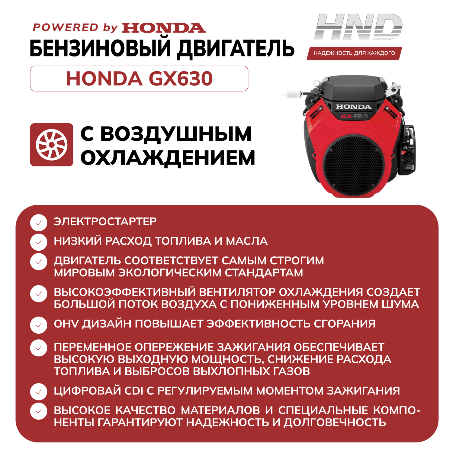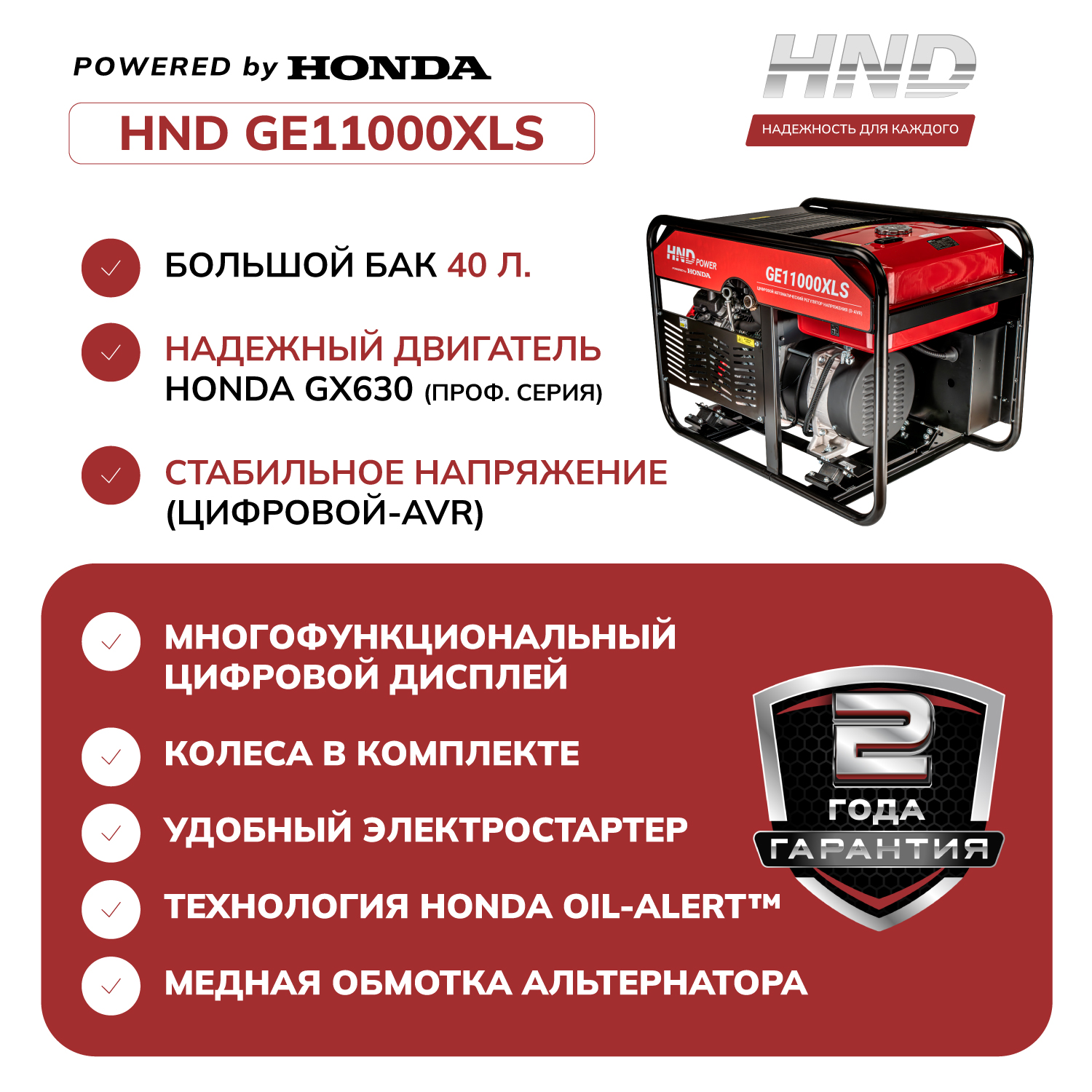 Бензиновый генератор HND GE11000XLS с мощностью 11 кВт - это высокопроизводительное решение для обеспечения электроэнергией в условиях отсутствия подключения к магистральной сети. Оснащенный проверенным временем двигателем Honda GX630, этот генератор ХНД готов к выполнению широкого спектра задач, начиная от аварийного электроснабжения частных домов и заканчивая поддержкой бизнес-процессов в магазинах и офисах. Двигатель Honda GX630 с OHV-дизайном обеспечивает надежность и долгий срок службы, благодаря чему генератор стабильно работает даже при высоких нагрузках.