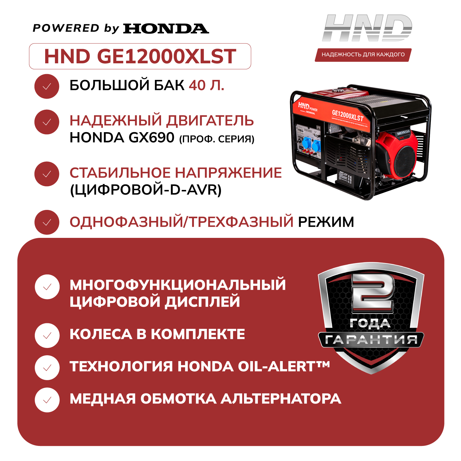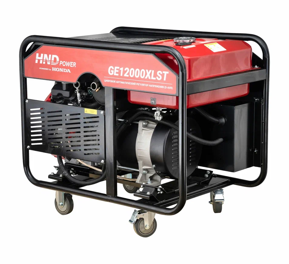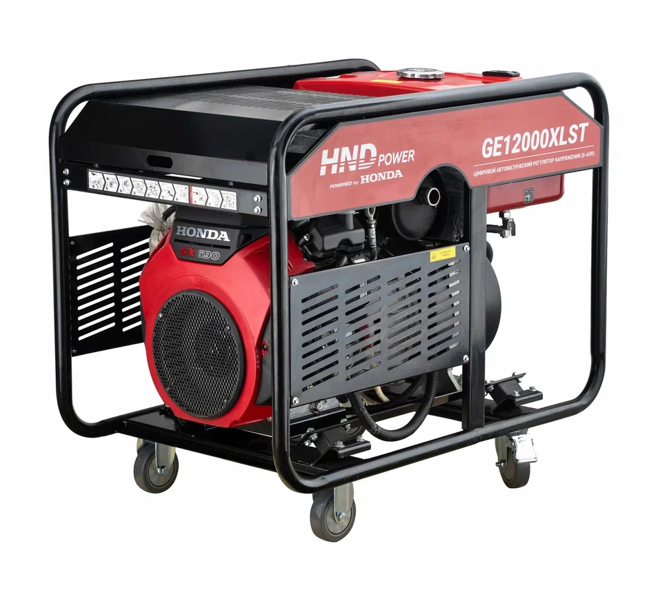 Хотите купить бензиновый генератор HND GE12000XLST с двигателем Honda (12 кВт)? Наша компания предлагает выгодную цену на данную модель садовой техники. Бензогенератор ХНД оснащен профессиональным двигателем Honda GX690 объемом 688 см³, обеспечивающим мощность до 13 кВт в трехфазном режиме (400 В) и 12 кВт в однофазном (230 В). Переключение между режимами позволяет адаптировать генератор для питания промышленного оборудования, сварочных аппаратов, систем автополива или бытовых приборов.