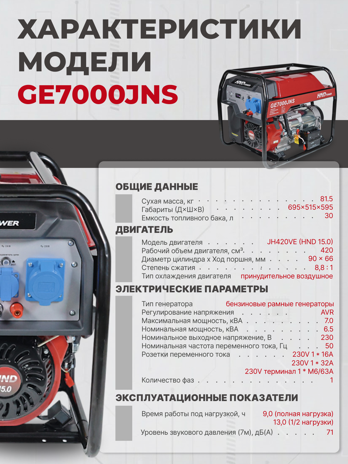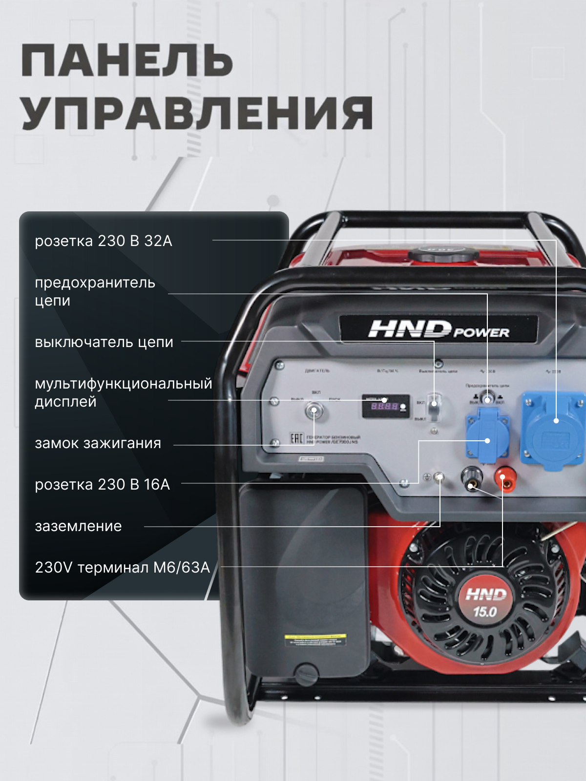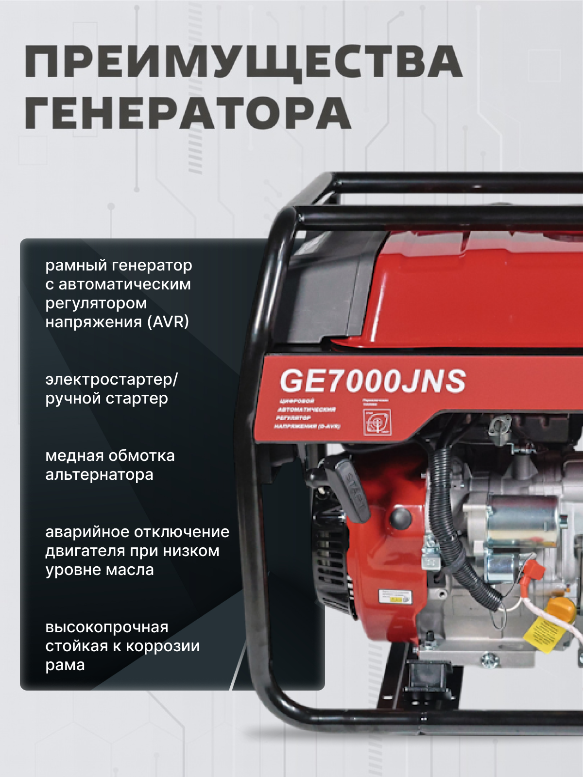 Инженеры установили в него одноцилиндровый четырехтактный двигатель JH420VE объемом 420 см³ (мощность - 15 л.с.). Благодаря конструкции с верхним расположением клапанов OHV достигается превосходный тепловой баланс, что снижает деформацию цилиндра и уменьшает расход масла. Для защиты силовой установки предусмотрена технология Oil Alert™: система автоматически отключает зажигание, если уровень масла падает ниже допустимого предела. Ключевое преимущество генератора HND GE 7000 JNS - наличие системы автоматического ввода резерва АВР и электростартера. При пропадании напряжения в центральной сети генератор запустится автоматически, обеспечивая бесперебойное питание котлов отопления, холодильного оборудования или производственных линий. Управление оборудованием упрощено благодаря цифровому дисплею и встроенному вольтметру. Особого внимания заслуживает эргономичность конструкции. Генератор ХНД защищен прочной стальной рамой, а в комплекте предусмотрены колеса и удобная рукоятка.