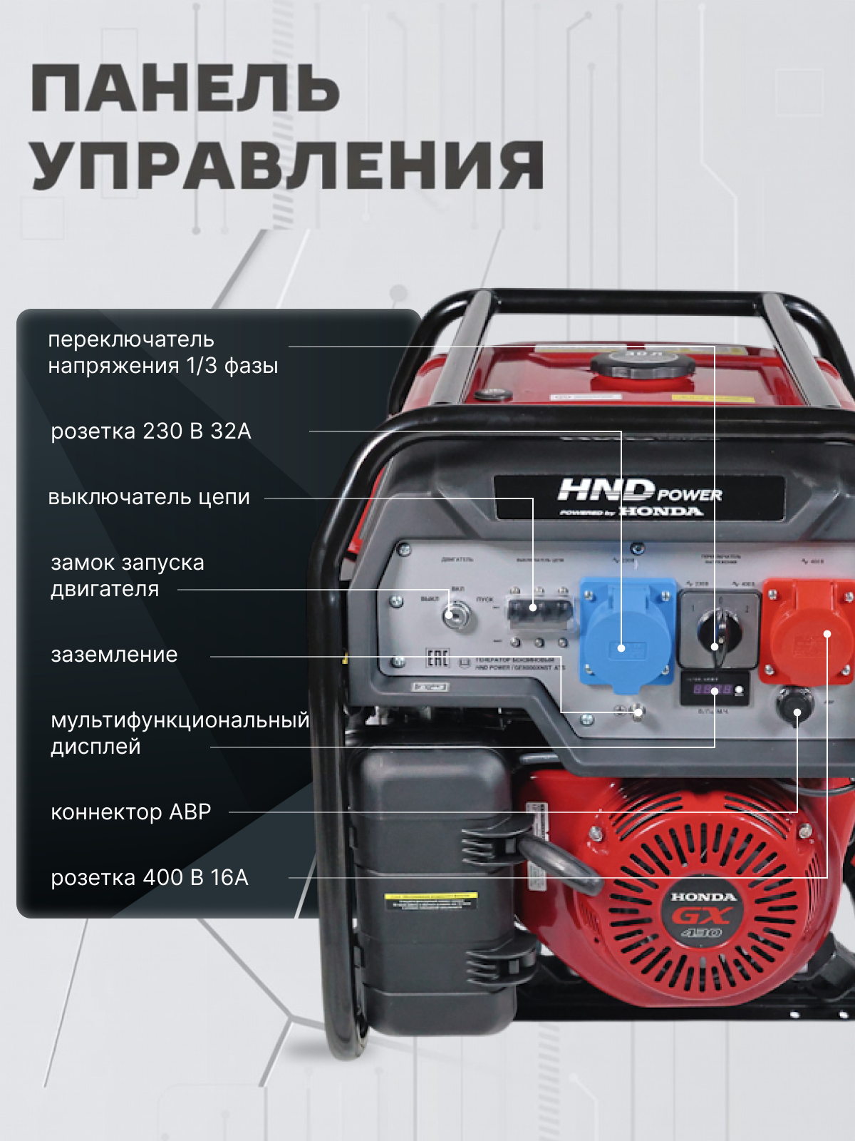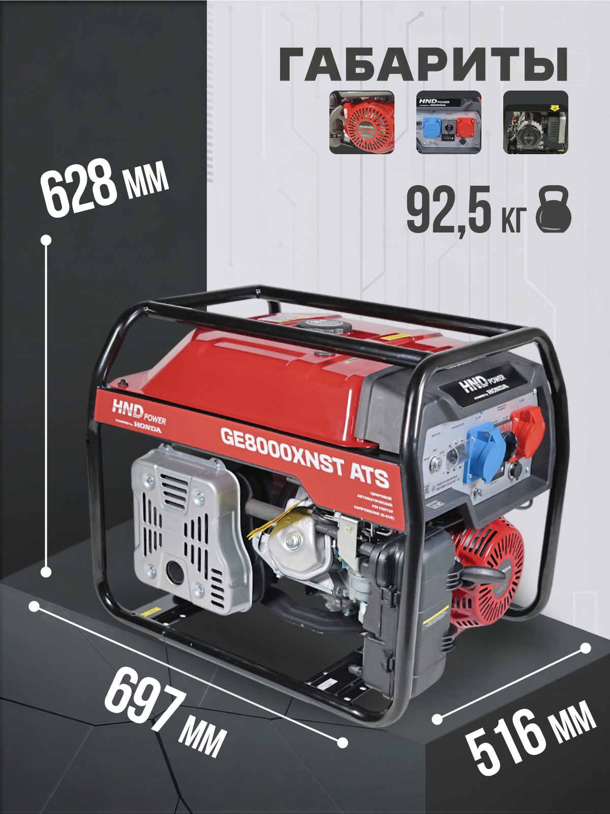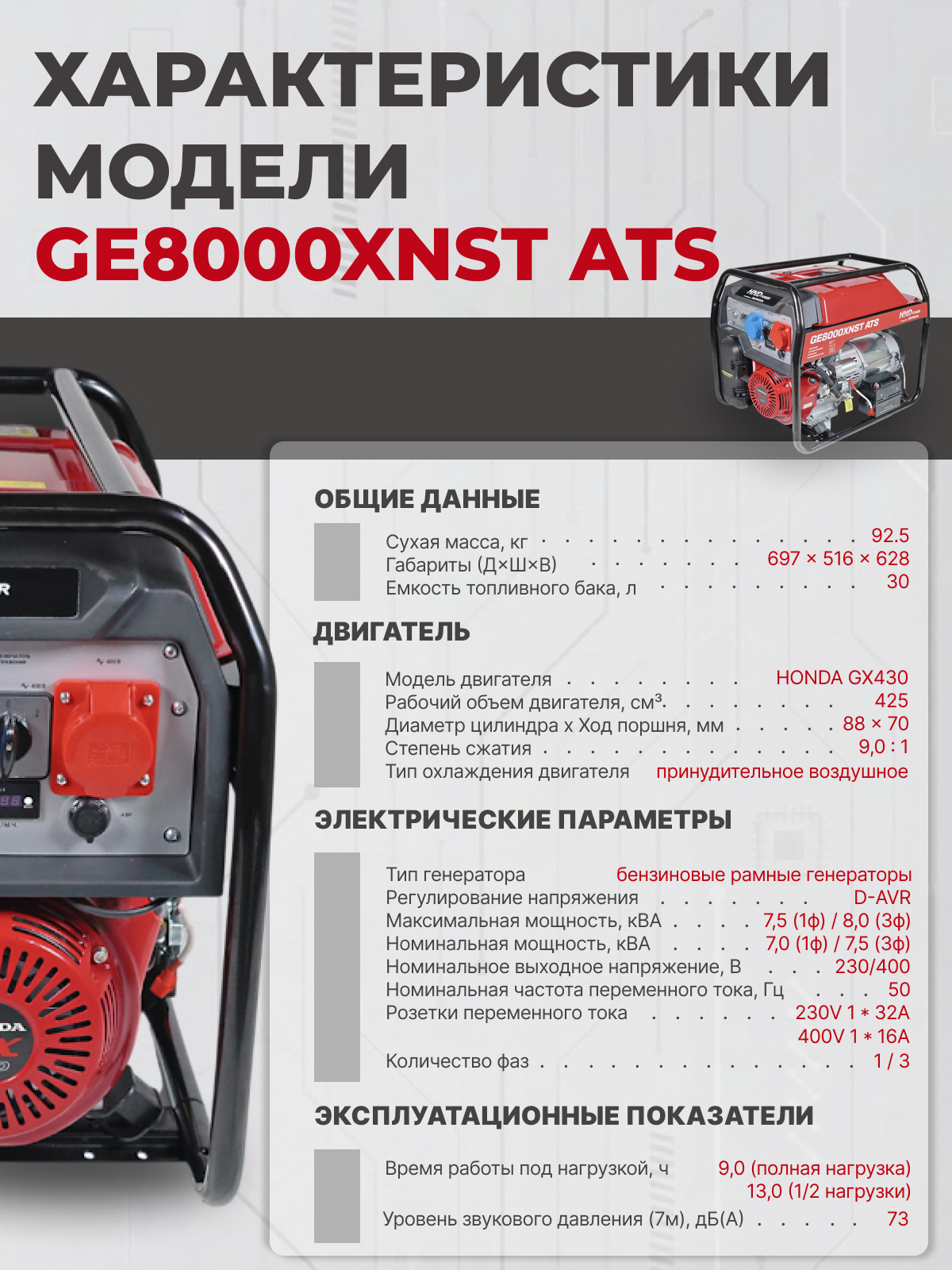 На официальном сайте нашей компании вы можете купить бензиновый генератор с системой АВР HND GE8000XNST ATS по выгодной цене. Мы являемся официальным дилером силовой техники ХНД и гарантируем 100% оригинальность товара, а также организуем его доставку по всей России. Новая модель сочетает проверенное качество Honda, электростартер и функцию автоматического ввода резерва. При пропадании напряжения в сети станция самостоятельно запускается, принимает нагрузку и автоматически возвращает питание на магистраль после его восстановления. Ключевое преимущество генератора GE 8000 XNST ATS - его универсальность. Электростанция способна выдавать мощность практически без потерь как в трехфазном режиме (400 В, до 8 кВт), так и в однофазном (230 В, до 7,5 кВт). Увеличенное сечение обмотки обеспечивает уверенный пуск и резерв для кратковременных пиковых нагрузок.