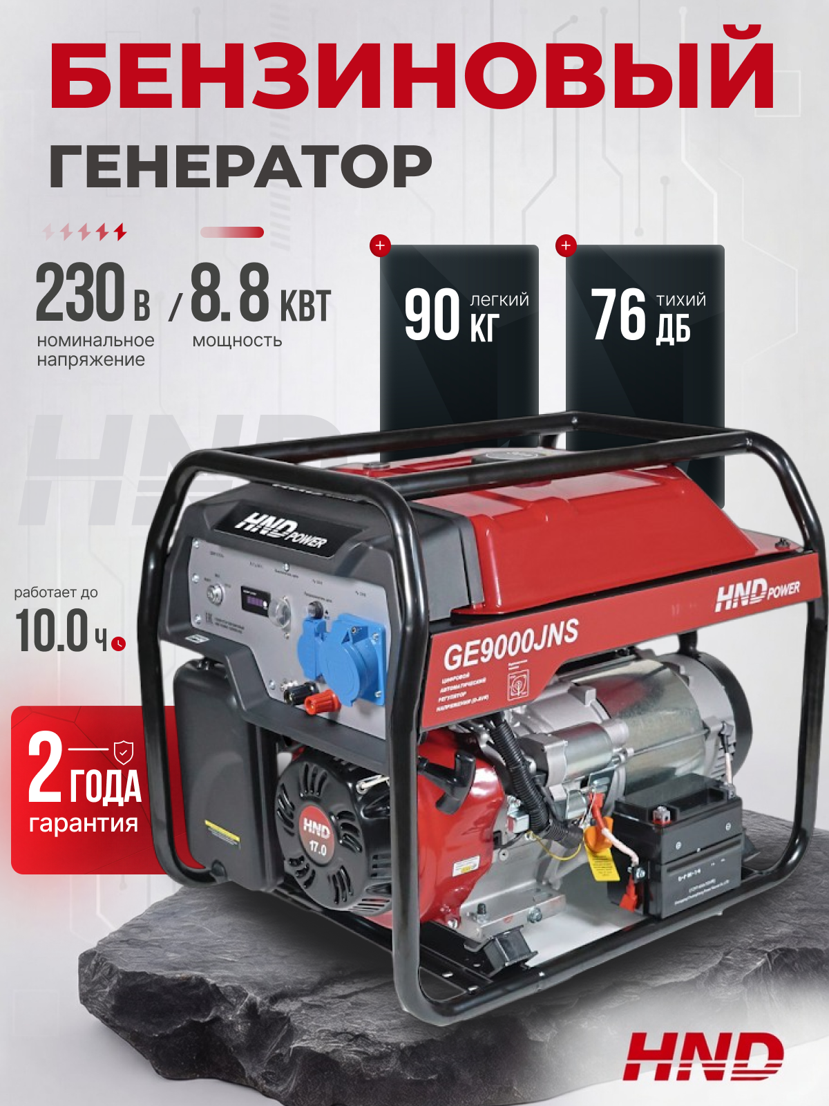Выбирая надежный источник энергии для дома или бизнеса, важно обращаться к проверенным поставщикам. Интернет-магазин «Хонда-Дом» является официальным дилером силовой техники HND, что гарантирует приобретение 100% оригинального оборудования с гарантией и доставкой по всей России. У нас вы можете купить бензиновый генератор HND GE9000JNS, предназначенный как для бытового использования, так и для профессиональных задач. Эта модель представляет собой автономный переносной источник переменного тока. Максимальная мощность составляет 8,8 кВт, что делает ее оптимальным решением для частного дома в качестве резервного источника питания.
