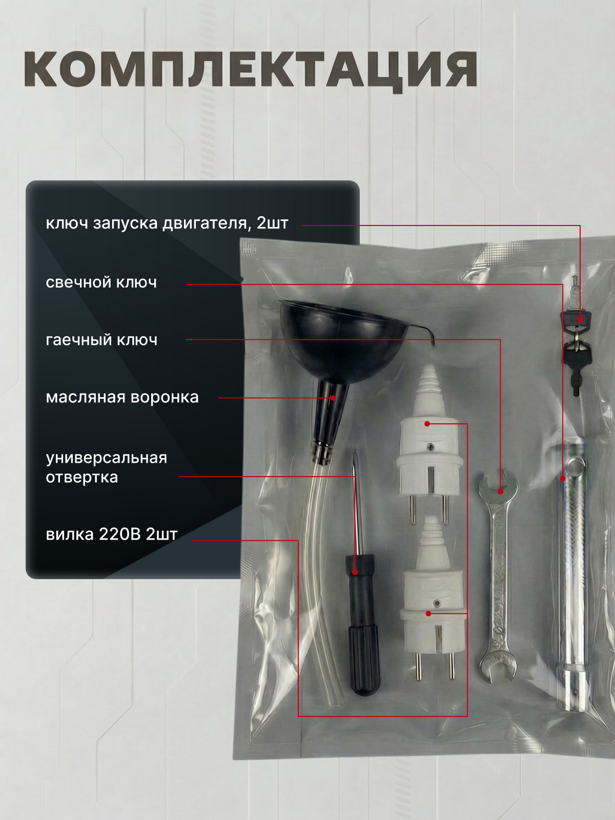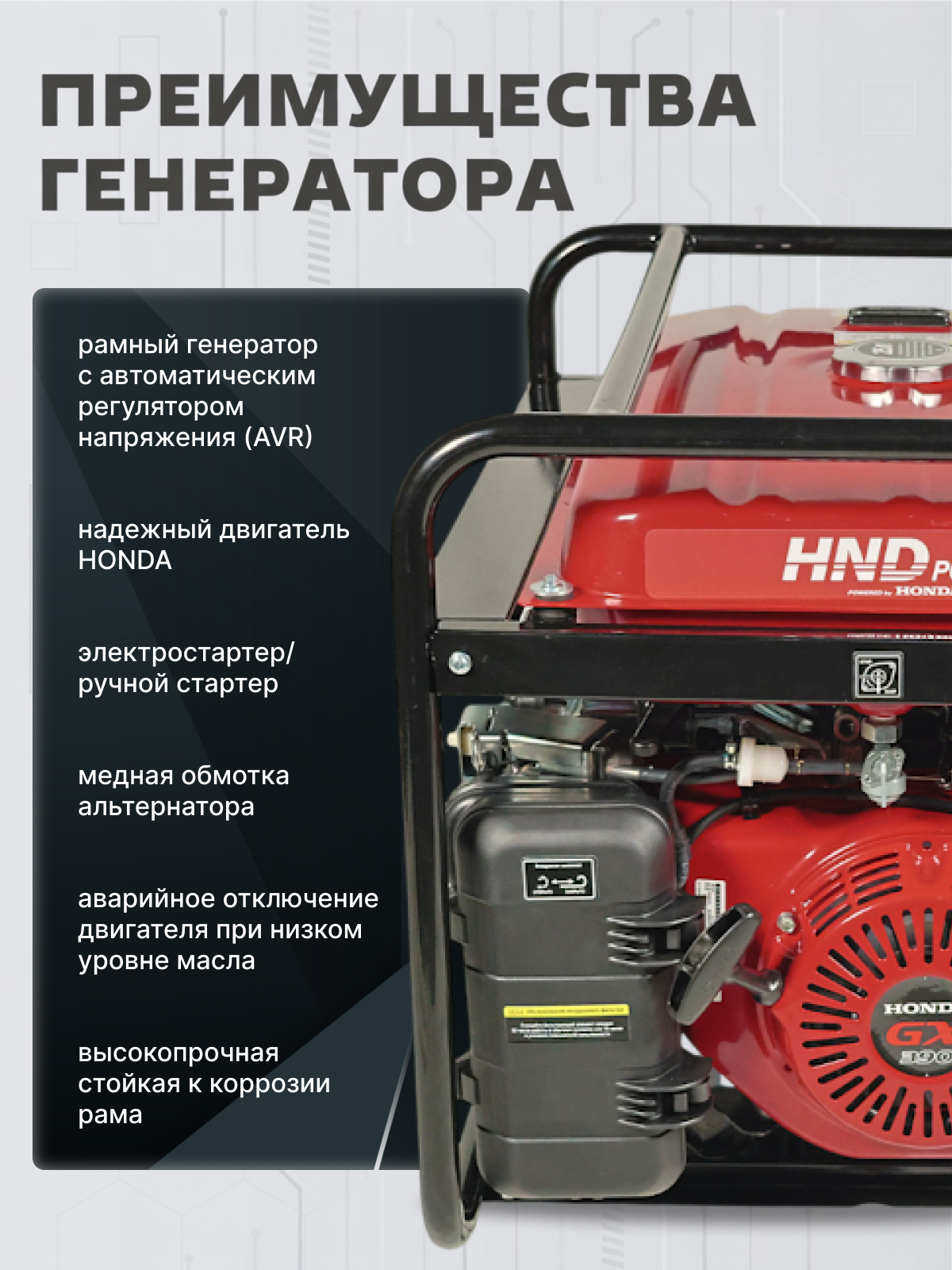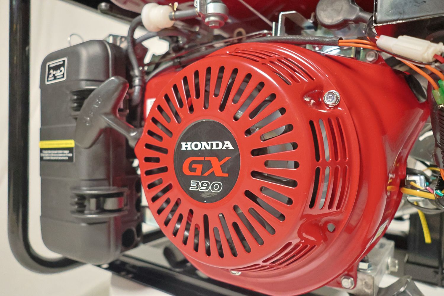 В модели используется легендарный четырехтактный OHV-двигатель Honda GX390. Агрегат объемом 389 см³ и мощностью 11,7 л.с. задает мировой стандарт надежности для профессионального оборудования. Наличие электростартера позволяет запускать установку нажатием одной кнопки, а для подстраховки предусмотрен и ручной стартер. Система автоматической декомпрессии гарантирует легкий пуск даже после длительного простоя или при низких температурах. Конструкция OHV с верхним расположением клапанов обеспечивает оптимальный тепловой режим. Антикоррозионная защита и чугунная гильза цилиндра продлевают ресурс двигателя, а технология Oil Alert™ автоматически отключает зажигание при критическом падении уровня масла.