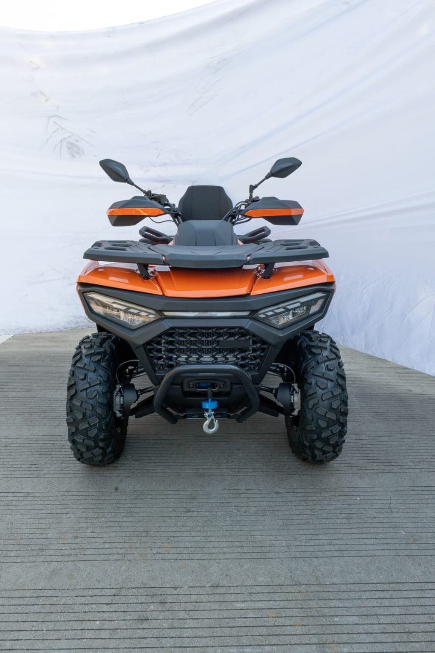 Оснащенный 41-сильным двигателем объемом 580 см³, квадроцикл HND QRX 650 развивает максимальную скорость до 98 км/ч. Высокий дорожный просвет 290 мм и независимая подвеска с двойными А-образными рычагами обеспечивают комфортную езду по пересеченной местности. Широкие шины и блокировка дифференциалов повышают устойчивость и проходимость квадроцикла. Мототехника адаптирована к российским условиям: вместительный топливный бак на 22 литра позволяет совершать длительные поездки, а защита бамперов и рычагов предотвращает повреждения корпуса. В базовой комплектации предусмотрены лебедка с тяговым усилием до 1,5 тонны, TFT-приборная панель с диагональю 7 дюймов и электроусилитель руля (EPS), который значительно облегчает управление.