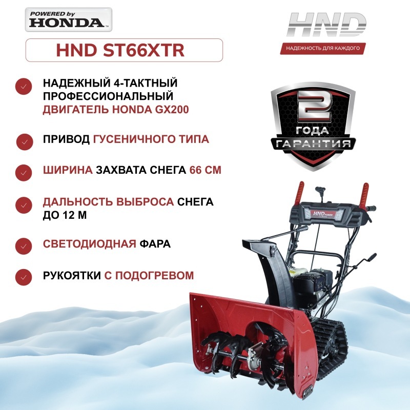 Официальный дилер садовой техники ХНД представляет вашему вниманию гусеничный снегоуборщик HND ST66XTR. Эта новинка сочетает проверенную надежность и инновационные решения для работы со снегом. Сердцем агрегата стал бензиновый двигатель Honda GX200 объемом 196 см³, гарантирующий стабильную мощность даже при экстремально низких температурах. Ключевым преимуществом модели ХНД является гусеничное шасси, обеспечивающее беспрецедентное сцепление с поверхностью. Это позволяет технике уверенно работать на обледенелых склонах, в глубоком рыхлом снегу и на неровном рельефе.